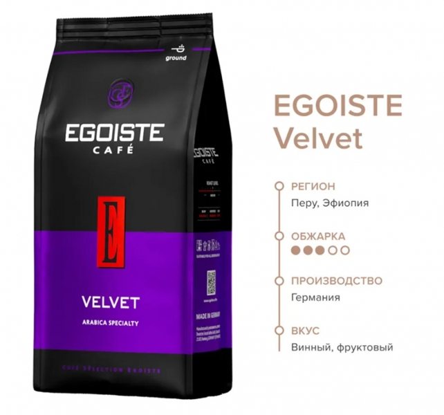 Кофе молотый EGOISTE VELVET - напиток для тех, кто ценит мягкий, сбалансированный вкус, легкий аромат и не очень большую крепость. В его составе - отборная 100% арабика, собранная в Эфиопии(Сидамо) и в Перу. Особенность кофе - в степени его обжарки. Она щадящая, немного светлее средней, благодаря чему внутри зерен сохраняются все арома-масла. Напиток отличается продолжительным сладковатым послевкусием с нотками молочного шоколада. Лучше всего качества этого продукта раскрываются при заваривании в френч-прессе — появляются оттенки фруктов и красных ягод. Кофе можно пить в самостоятельном виде или делать на его основе напиток колд брю.