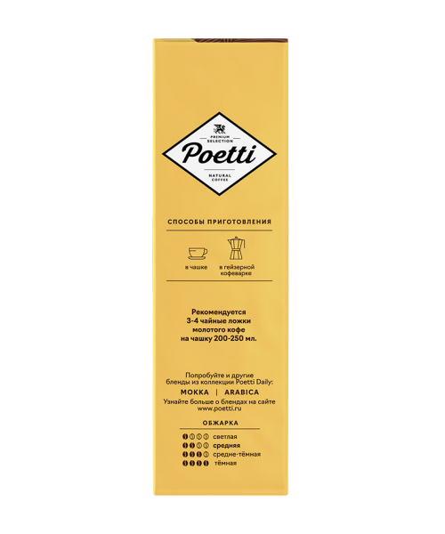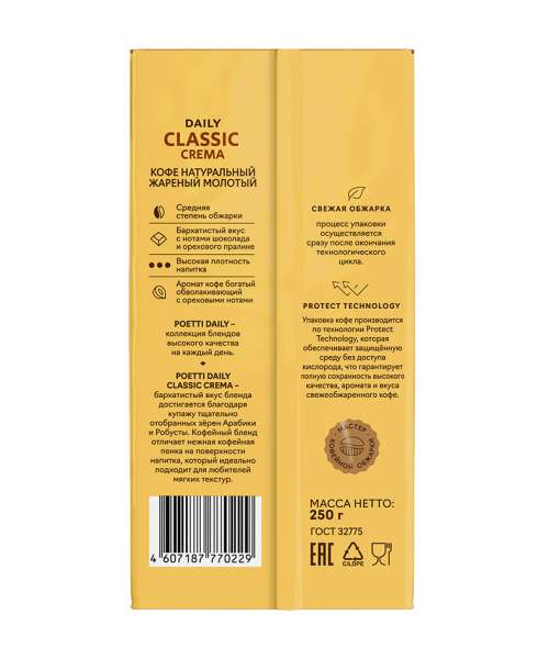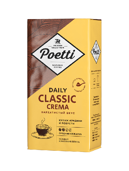 Poetti Daily — это линейка натурального кофе высокого качества на каждый день. Эксперты с многолетним опытом в обжарке кофе и профессиональные бариста разработали бленды, чтобы кофе радовал Вас вкусом и заряжал энергией! Poetti Daily Classic Crema (Поэтти Дейли Классик Крема) — бодрящий кофе для продуктивного дня. Сочетание отборной арабики и премиальной робусты создает бархатистый вкус Daily Classic Crema. Кофе с нотами шоколада и орехового пралине с богатым ореховым ароматом. Напиток высокой плотности с нежной кофейной пенкой порадует любителей мягких текстур. Средняя степень обжарки. Classic – великолепная кофейная смесь с богатым и продолжительным послевкусием. Тщательно отобранные зерна арабики из Латинской Америки дарят напитку богатый обволакивающий аромат с ореховыми нотками. Большое количество российских потребителей предпочитают более крепкий (горький) кофе, поэтому специально для этого был сделан новый бленд Классик. В состав Poetti Classic входит робуста, которая придает кофе изысканную горчинку. Массовая доля кофеина в 100 мл готового кофе – не менее 0,7%