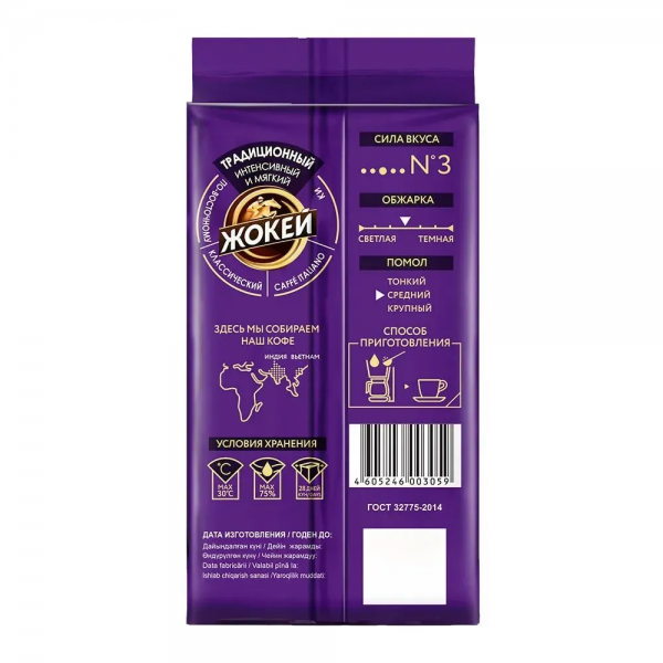 Средний помол, средняя обжарка, традиционный, интенсивный и мягкий вкус.