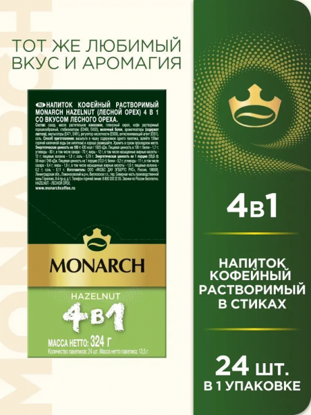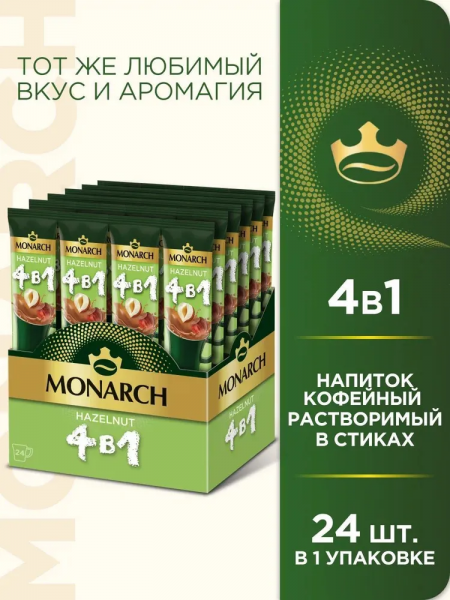 Кофе растворимый Лесной Орех в стиках Monarch Hazelnut 4 в 1 (24 стика) 324 гр.