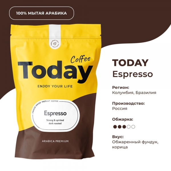 Погрузитесь в атмосферу итальянской кофейни, не выходя из дома. TODAY Espresso — это революция в мире растворимого кофе. Мы создали насыщенный, бархатистый и невероятно ароматный напиток, который передаёт всю суть классического эспрессо в его самом удобном формате. Это выбор для тех, кто ценит характер, пряную глубину и бескомпромиссную насыщенность в каждой чашке.
