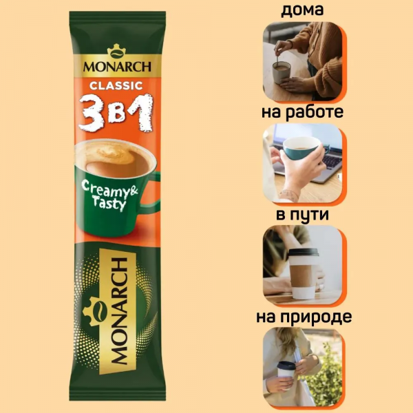 Кофе Monarch 3в1 классика— это оригинальный притягательный микс в новом ярком дизайне и с улучшенной рецептурой, которая дарит богатый аромат кофе и сбалансированный вкус. Удобный формат индивидуальных упаковок позволит насладиться напитком, где бы Вы ни находились.