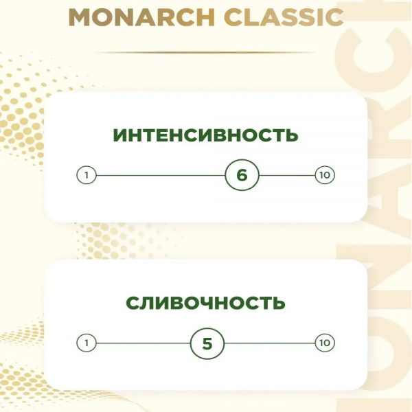 Сбалансированный кофейный напиток с гармоничным сочетанием классического кофейного вкуса, карамельной сладости и нежной сливочности. Золотая середина в линейке Monarch.