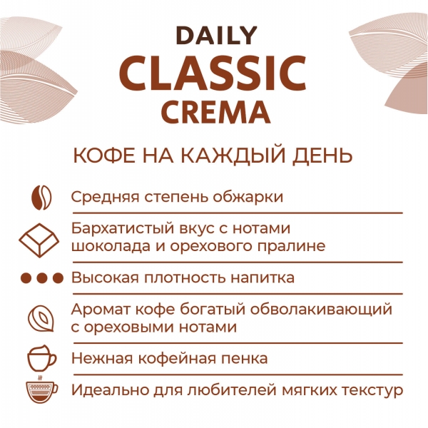 Бархатистый вкус бленда достигается благодаря купажу тщательно отобранных зёрен Арабики и Робусты. Кофейный бленд отличает нежная кофейная пенка на поверхности напитка, который идеально подходит для любителей мягких текстур